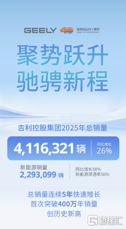 2025年,吉利控股集团全球总销量4,116,321辆首胜证券,同比增长26%,实现连续五年快速增长,年销首次突破400万大关,创历史新高;其中新能源销量2,293,099辆,同比增长58%,新能源渗透率56%,成为集团市场增长的主要驱动力,在全球车企中处于领先地位。